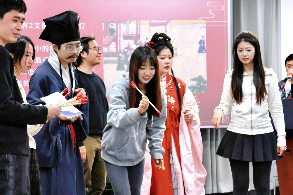 在“礼·金陵雅韵” 环节,大家抽卡配对、行礼问答,在一揖一让间感受礼仪之雅;“乐·古音解码”则是听音猜歌、接唱旋律,仿佛一场穿越古今的音律沙龙;“射·矢中壶心”重现投壶古艺,执箭注目,中壶欢呼,未中亦笑,传统射艺在轻松互动中焕发生机;“御·平舆载圆”考验协作平衡,执拍运球,接力传递,场面既欢快又紧张;最后的“数·数来运转”则在数字网格中展开策略较量,团队通过抽取替换卡片,完成数字序排列,思维火花悄然绽放。五项活动融文化、技艺、协作为一体,现场气氛热烈,师生在互动中深化情谊,亦感受着传统与现代的生动交融。